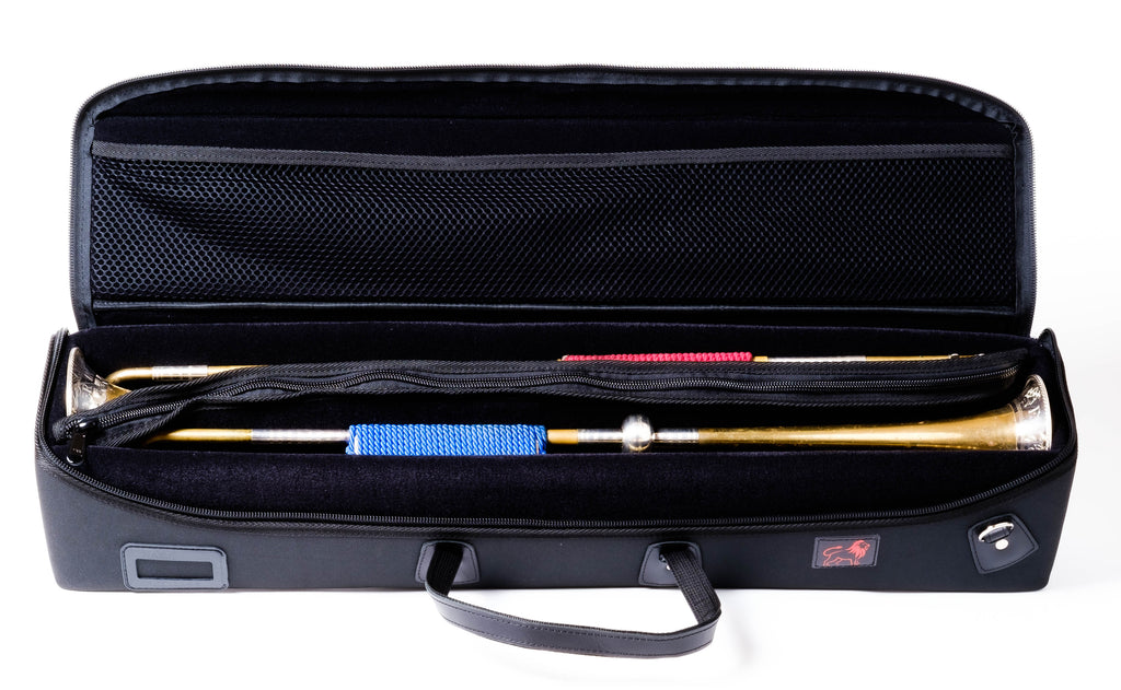 The double long trumpet case will carry two long natural or 4-hole trumpets without removing the crooks. It includes a zippered, padded divider for crooks, mouthpieces, etc. along with backpack and shoulder straps.